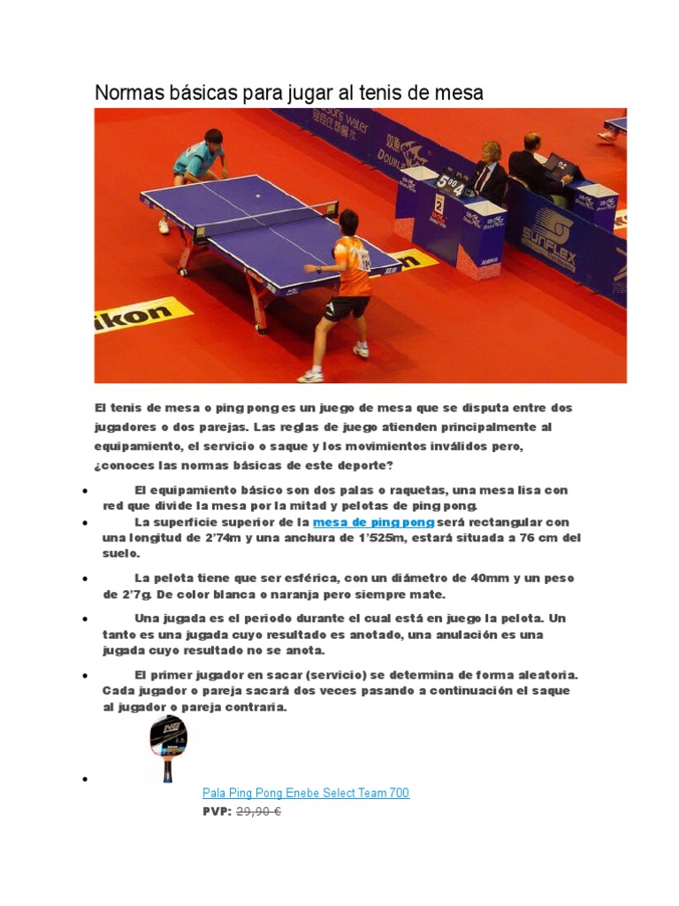 El tenis de mesa o ping pong es un juego de mesa que se disputa entre dos jugadores o dos parejas. El reglas del ping pong se centra principalmente en los participantes, el equipamiento, el servicio o saque, la puntuación y los movimientos inválidos. Mabelkatherine2204 mabelkatherine2204 normas básicas para jugar al tenis de mesa: We use your linkedin profile and activity data to personalize ads and to show you more relevant ads. O jogo é disputado numa melhor de sete games, sendo que um game é vencido pelo primeiro jogador a fazer 11 pontos. Reglas del tenis de mesa 2.1 la mesa 2.1.1 la superficie superior de la mesa, conocida como superficie de juego, será rectangular, con una longitud de 2,74 m y una anchura de 1,525 m, y estará situada en un plano horizontal a 76 cm del suelo. El equipamiento básico son dos palas o raquetas, una mesa lisa con red que divide la mesa por la mitad y pelotas de ping pong. Las reglas del tenis de mesa dicen que el servicio debe comenzar con poner la pelota en su palma de la mano abierta boca arriba para que el árbitro y el adversario vean la pelota y ahí hacer un lanzamiento hacia arriba de por lo menos 16cm y cuando el balón se está cayendo haciendo el servicio, haciendo que quique en su lado de la mesa y. La mesa el conjunto de la red la pelota la raqueta definiciones servicio correcto devolución correcta orden de juego anulación tanto juego partido. Para cada juego, el primer jugador en alcanzar 11 puntos gana ese juego, sin embargo, un juego debe ganarse por al menos un margen de dos puntos. 0,76 m altura de la red: Gonzalo acosta juega tenis de mesa adaptado desde el de los 12 a 17 años de edad jugó al tenis de mesa en un nivel. Reglas del tenis de mesa.